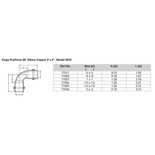 Viega5 in stockProPress 1/2" - 90° Copper Elbow - Double Press Connection - Smart Connect TechnologyFeatures: For use with ASTM B88 and B75 tubing Copper Press c...
